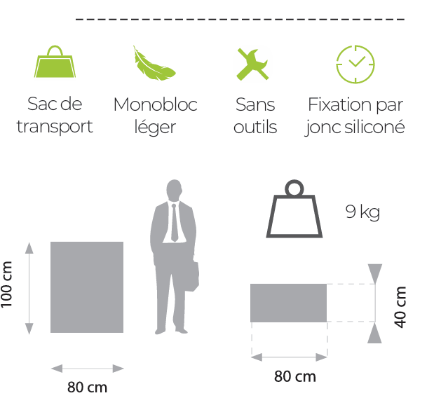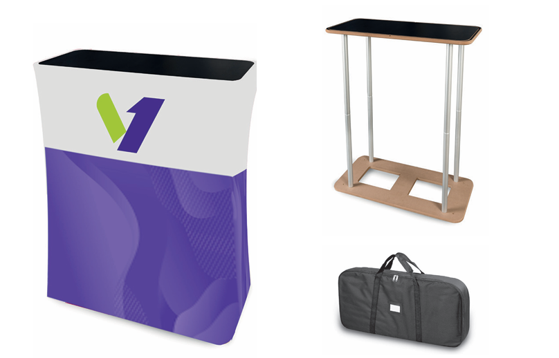 Le comptoir tubulaire rectangulaire est équipé d’une structure aluminium modulaire légère et robuste, associée à un visuel textile fixé par jonc silicone (SEG). Ce système assure une tension parfaite du visuel, sans plis ni reflets, pour un rendu professionnel haut de gamme.