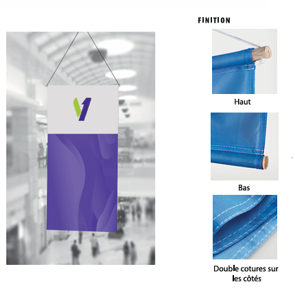 Le visuel est imprimé sur textile et maintenu en haut et en bas par des tourillons bois cylindriques, avec un cordon ou fil de suspension discret.