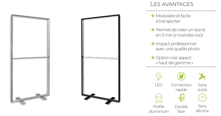 Le Cadre LED 100 est un caisson lumineux textile rétroéclairé, conçu pour offrir un rendu visuel puissant et homogène. Grâce à son profilé aluminium de 100 mm, il accueille des visuels tendus en textile imprimé par sublimation, pour une qualité d’image exceptionnelle et un effet premium garanti.