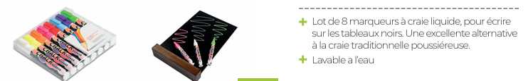 Le marqueur à craie liquide est un feutre effaçable à l’eau conçu pour écrire sur toutes surfaces non poreuses : ardoises, tableaux noirs, vitres, vitrines, plexiglas, panneaux plastifiés… Il offre un tracé net, opaque, sans poussière, avec une excellente visibilité même à distance.