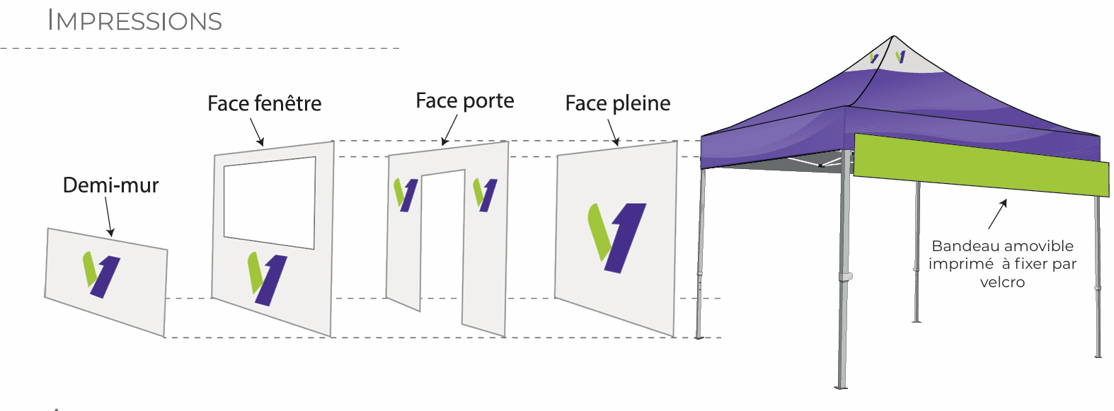 Le mur plein imprimé en polyester 300 g/m² ignifugé, est la solution idéale pour fermer et personnaliser votre tente pliante professionnelle. Fabriqué en textile imperméable et traité anti-UV, il offre une protection complète contre la pluie, le vent et le soleil, tout en valorisant votre image grâce à une impression sublimation quadri haute définition.