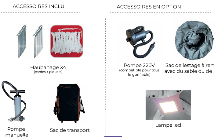 Avec son diamètre de boudins optimisé, elle garantit une stabilité fiable en usage indoor/outdoor. Sa structure légère et son système de gonflage One Pump permettent une installation en moins de 10 minutes, sans outil ni soufflerie permanente.