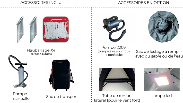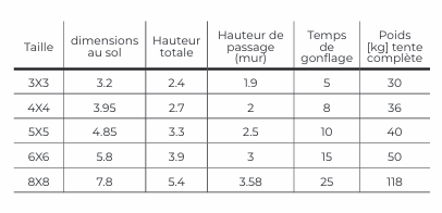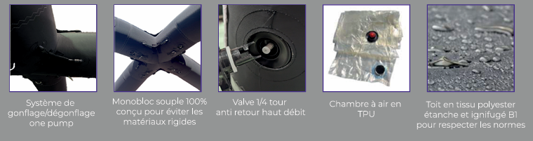 Conçue en Dacron avec de gros boudins pour une solidité maximale, et dotée d’un toit en tissu polyester étanche et ignifugé B1, elle résiste aux conditions climatiques extrêmes (vent, sable, neige) et répond aux normes de sécurité ERP.