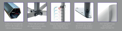 La tente pliante Indust’O est le modèle le plus robuste de la gamme. Conçue pour une utilisation intensive et longue durée, elle est équipée de tubes en aluminium Ø 55 mm qui garantissent une résistance maximale face aux conditions extérieures.