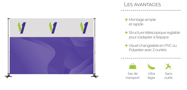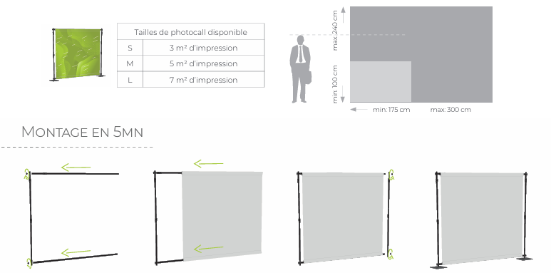 Nos photocalls textiles autoportants offrent une solution élégante et professionnelle pour valoriser les stands, salons, événements ou espaces de vente. Grâce à leur structure aluminium légère et pliable, ils se montent rapidement sans outil et se transportent facilement dans leur sac dédié