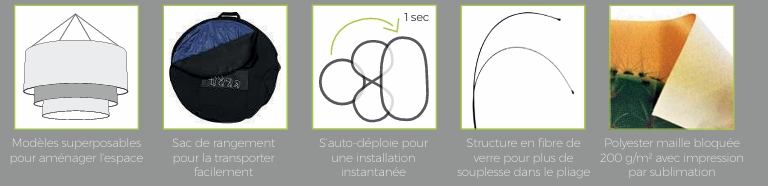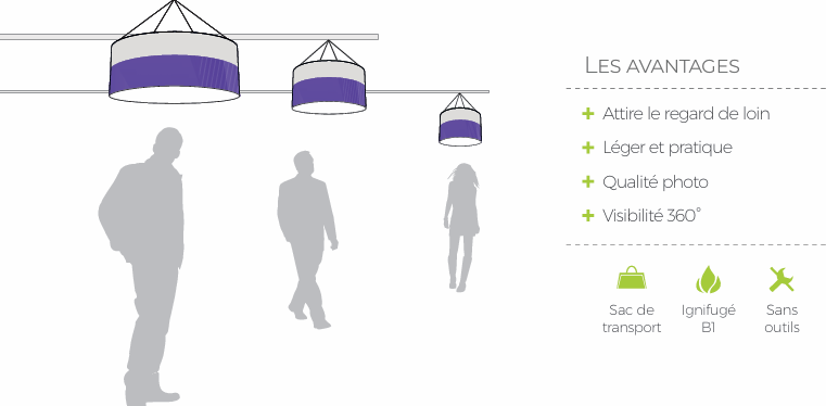 La suspension cylindrique Pop-Up à structure en fibre souple est conçue pour une installation express, à la manière d’une tente de camping. Il suffit de la déplier pour qu’elle prenne instantanément forme. Son visuel textile tendu assure une communication visible à 360°, idéale pour les stands d’exposition, corners, galeries et événements en intérieur.