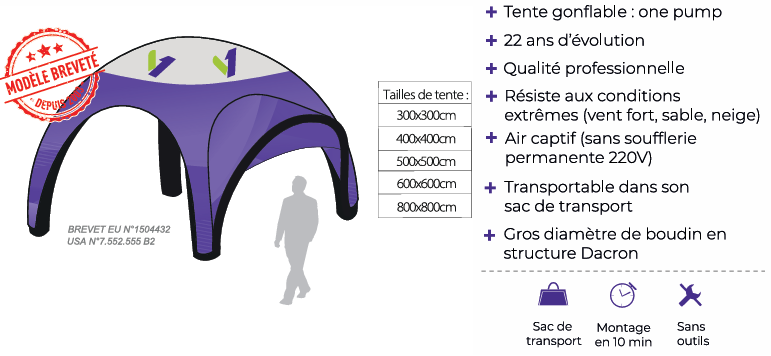 La tente gonflable X Roof 2 est un abri événementiel haut de gamme, conçu pour une utilisation intensive en extérieur. Sa structure à air captif (sans soufflerie permanente) et son système de gonflage One Pump permettent un montage rapide en moins de 10 minutes, sans outil.